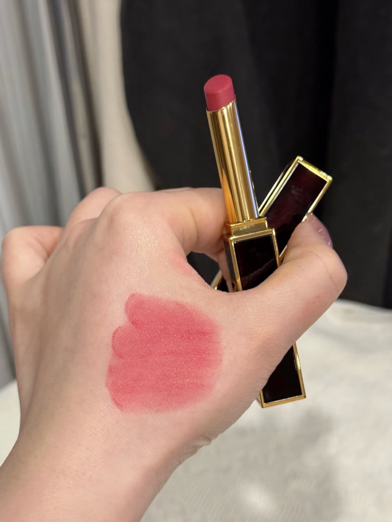 膏體柔滑塗抹絲絨啞光,暖玫瑰色調修飾唇形提亮氣色,霧面質感細膩持久,細長黑金管身優雅實用,完美平衡顯色與舒適。