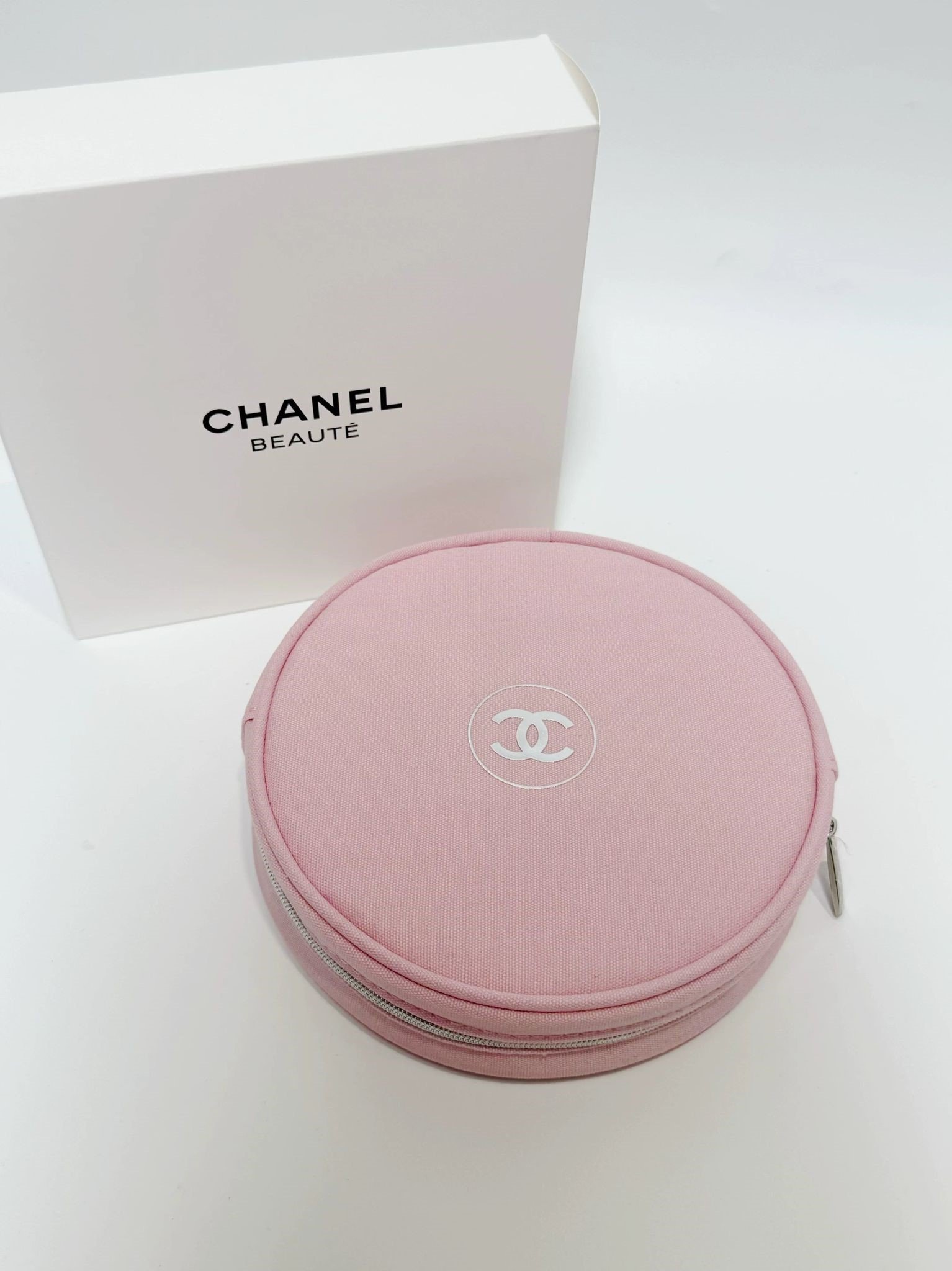 Chanel經典粉色圓形化妝袋,奢華絨面材質搭配金屬雙C logo拉鏈,輕便圓潤設計完美收納化妝品護膚品,旅行必備配件,粉嫩色調展現法式優雅,內裡防水塗層易清潔,經久耐用承載日常精緻生活態度。
